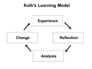 David Kolb devised a simple, sensible model for learning, a cycle that includes experience, reflection, analysis, and change. It is called a “learning cycle” because after we change something, try something, we experience what we’ve changed, and around we go again…and again….